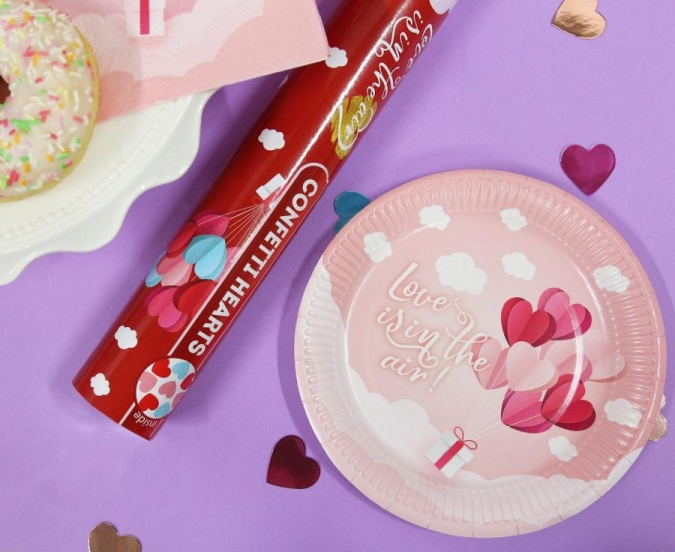 Парти конфета цилиндър, пълна с различни по цвят конфети във формата на сърца, които създават много настроение и усмивки.