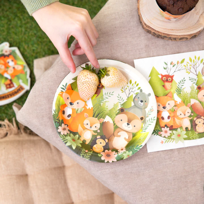 Всички горски животни, поставени върху хартиена чиния, са нетърпеливи за игра и любопитни за вкусотиите, приготвени за гостите.