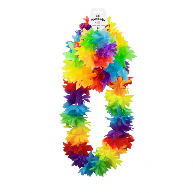 Комплектът включва хавайско колие, лента за глава и две гривни. Перфектният костюм за хавайско парти.